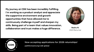 At CDK Global, we’re excited to partner with Path Forward to welcome returners back into the workforce. We appreciate the skills, experiences, and perspectives that you bring to our company and teams.