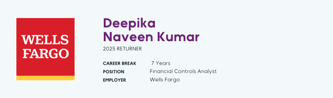 Deepika joined Wells Fargo in 2025 after successfully completing the Wells Fargo Glide – Relaunch USA returnship. She joined as a Financial Controls Analyst and has been loving her time back after over 7 years out of the paid workforce. Here is what she has to say about her experience: What type of work did you do before stepping away from the workforce, and how long were you out? I…